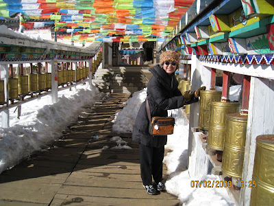 木棧道旁有座小寺廟,屬於喇嘛教,因為有祈福的紙繽紛掛著,還有法輪.